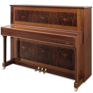 La réalisation indonésienne de ce modèle permet à la mécanique de proposer une précision appréciable et une bonne homogénéité sur l’ensemble du clavier. malgré tout, le balancier reste court et ne peut privilégier de façon satisfaisante un toucher efficace dans toute la palette de nuances. la bonne qualité des matériaux utilisés notamment dans les transmissions des vibrations, chevalets et table d’harmonie, ne suffit pas à compenser une faible taille de l’instrument, ni l’utilisation de marteaux aux feutres très denses et à l’impact peu mesuré sur les cordes. l’instrument ne peut développer une tessiture ample et complète mais se concentre sur le registre aigu sans jamais prétendre à une expression de profondeur harmonique. confiné dans ce rôle de piano de travail, il s’avère être un piano d’expression de bonne qualité bien placé sur le plan tarifaire.