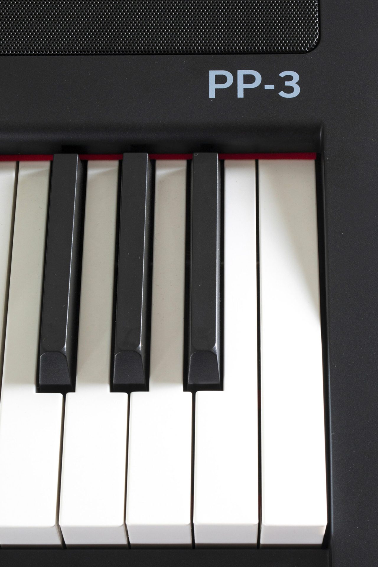 Le PP-3 est l’un des claviers portables les moins chers du marché. C’est un excellent instrument d’entrée de gamme avec un rapport qualité/prix optimal. Il offre la une possibilité de jouer chez soi sans s’encombrer. Par son poids et sa taille, il est facilement transportable, pour la scène et la salle de répétition. Le pianiste a la possibilité de calibrer touche par touche le clavier afin d’affiner la dynamique. Les boutons de contrôles permettent d’accéder et de gérer les paramètres essentiels tels que le volume, le métronome ou le choix des sons. À ce prix et avec ces fonctionnalités, le PP-3 se place comme incontournable dans son registre.