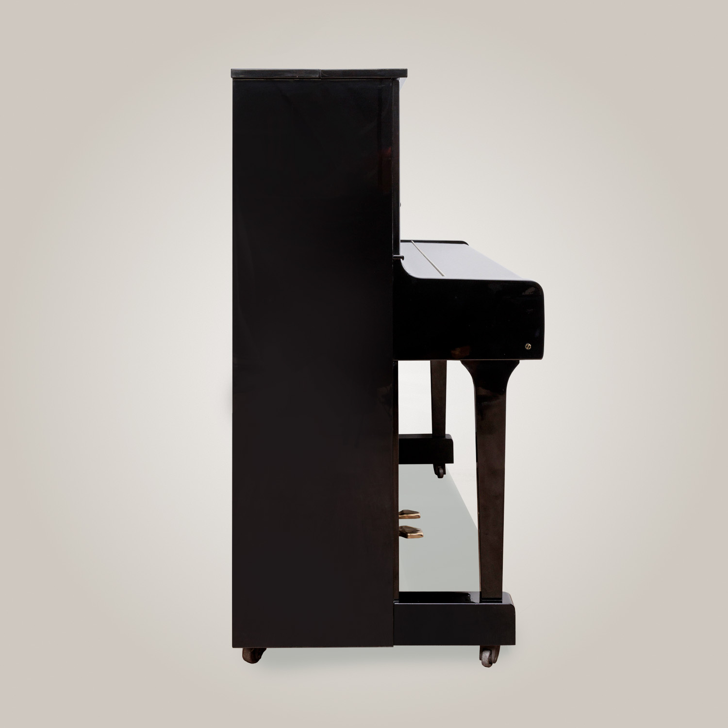 Couvercle en deux parties. Cylindre à fermeture manuelle. Roulettes. Consoles. Serrure. Trois pédales en laiton (forte, douce, sourdine).