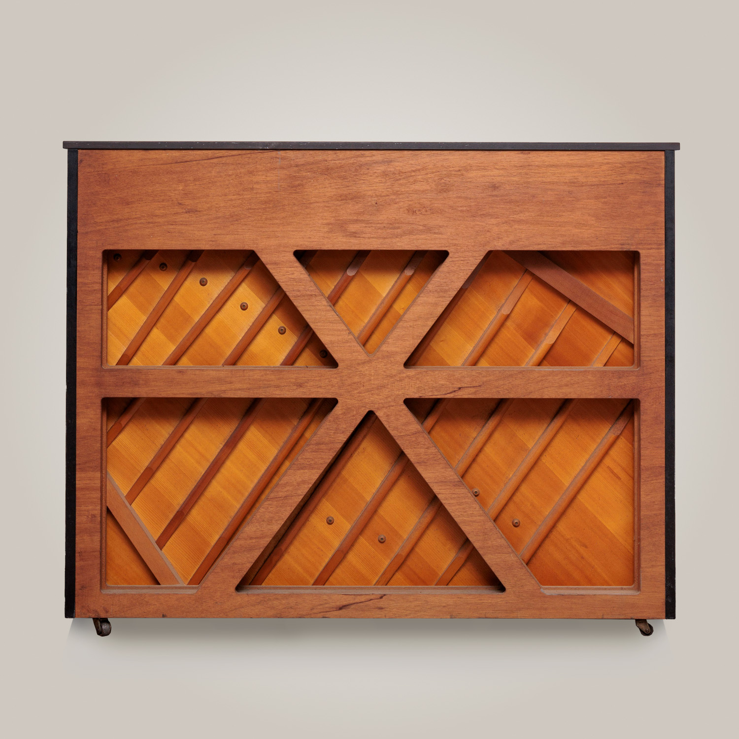 Couvercle en deux parties. Cylindre à fermeture manuelle. Serrure. Roulettes. Consoles. Patins. Trois pédales en laiton (forte, douce, sourdine).