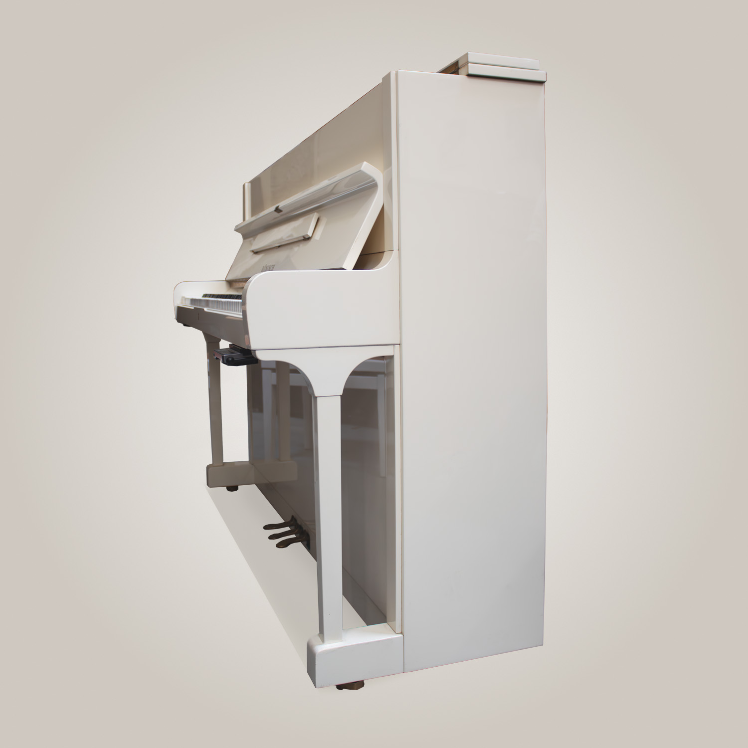 Revêtu d’un blanc nacré brillant particulièrement élégant, plus subtil qu’un blanc pur, le meuble capte la lumière avec douceur et profondeur. Le cylindre a été entièrement refait, intérieur et extérieur, et l’instrument se présente aujourd’hui dans un état remarquable. Équipé d’un système silencieux Genio monté a posteriori, il offre également une pratique discrète sans altérer l’identité acoustique du piano.